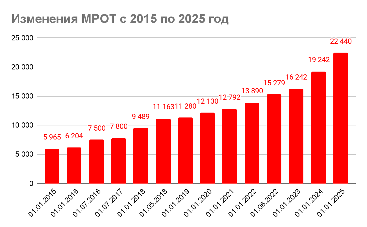 В настоящее время МРОТ составляет 22 440 рублей. Его размер ежегодно устанавливается Государственной Думой на федеральном уровне и не может быть ниже регионального прожиточного минимума. Пересмотр суммы происходит с учетом инфляции, а с 2025 года расчеты будут основываться на медианной зарплате (64,6 тыс. рублей по итогам второго квартала), согласно новому законодательству. МРОТ является ключевым показателем, используемым для расчета отпускных, больничных, командировочных, алиментов, штрафов, а также влияет на доплаты к пенсиям и пособия по уходу за ребенком.